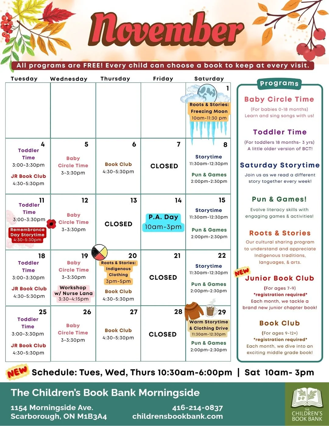 Our program calendar lists all of the programs and activities taking place at the The Children’s Book Bank Morningside this month.